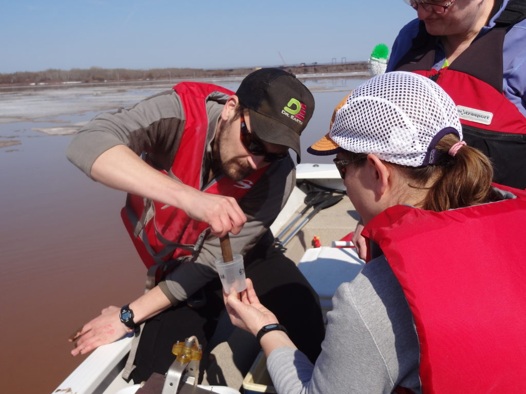 Wisconsin Sea Grant-funded researchers collect a sediment sample from the St. Louis River Estuary. (Photo: Marie Zhuikov)