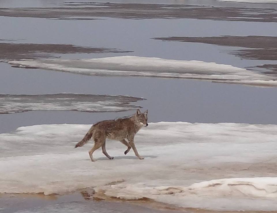 A coyote crosses the ice on the St. Louis River Estuary. Image credit: Marie Zhuikov, Wisconsin Sea Grant