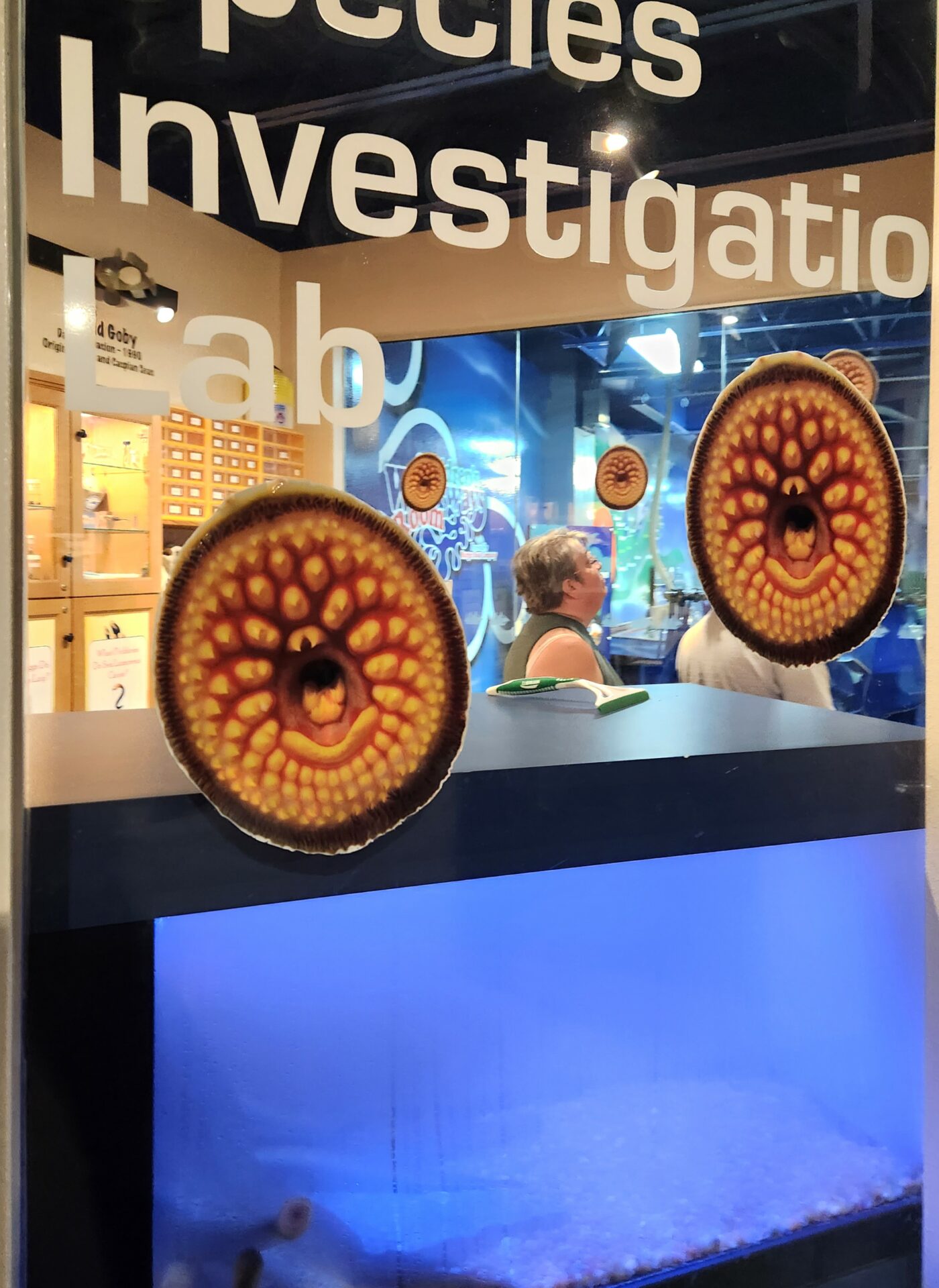 Attack_of_Sea_Lampreys_Wisconsin_Maritime_Museum (1) Stickers depicting sea lamprey mouths at the invasive species lab.